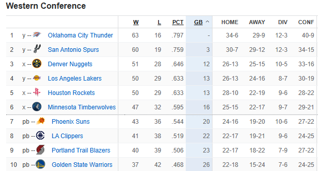 目前西部第六的森林狼领先太阳4个胜场,由于只剩下3场常规赛,因此森林狼锁定一个季后赛席位,太阳正式无缘直通季后赛,确定要打附加赛,因此西部前六正式出炉,分别是雷霆、马刺、掘金、湖人、火箭和森林狼。